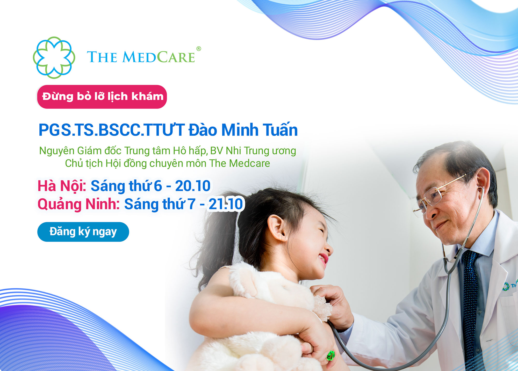 | HÀ NỘI & QUẢNG NINH | ĐỪNG BỎ LỠ LỊCH KHÁM PGS.TS.BS ĐÀO MINH TUẤN – NGUYÊN GIÁM ĐỐC TRUNG TÂM HÔ HẤP – BV NHI TRUNG ƯƠNG– Tại The Medcare Hà Nội: Thứ 6, ngày 20/10 (từ 8h30 – 11h30)- Tại The Medcare Quảng Ninh: Thứ 7, ngày 21/10 (8h30 – 12h) Không