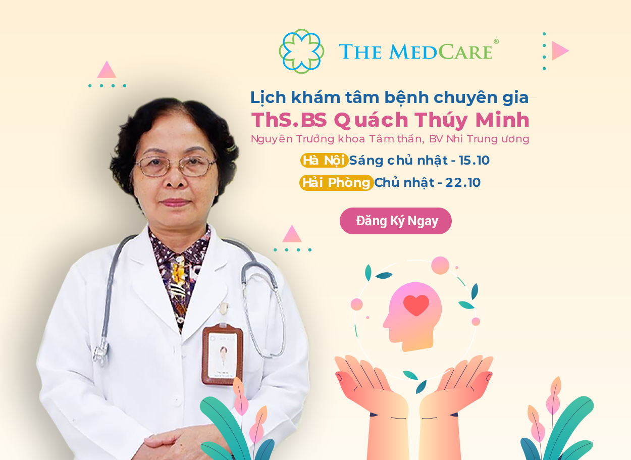 LỊCH KHÁM TÂM BỆNH CHUYÊN GIA THÁNG 10 Do số lượng ca khám có hạn, ba mẹ hãy nhanh tay đăng ký để không bỏ lỡ lịch khám duy nhất của ThS.BS Quách Thúy Minh – Nguyên Trưởng khoa Tâm thần, BV Nhi Trung ương trong tháng 10, cụ thể: Tại The Medcare Hà Nội:- Chủ