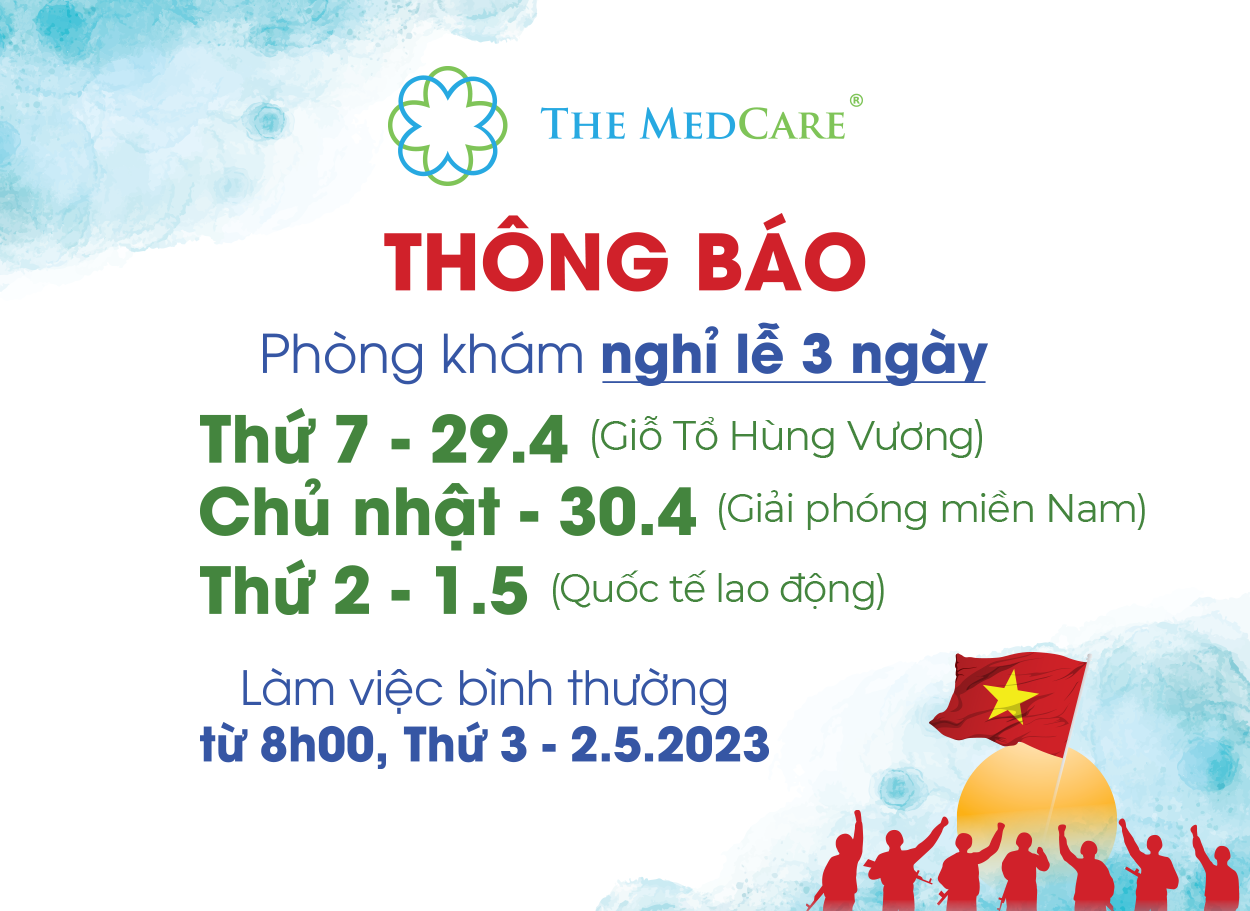 THÔNG BÁO: LỊCH NGHỈ LỄ DỊP 30/4 – 1/5 Để thuận tiện cho ba mẹ sắp xếp đưa trẻ đi khám bệnh và tiêm chủng, The Medcare xin thông báo lịch nghỉ lễ trên toàn hệ thống phòng khám như sau: Phòng khám nghỉ làm việc 3 ngày: – Thứ 7, ngày 29/4 (Giỗ