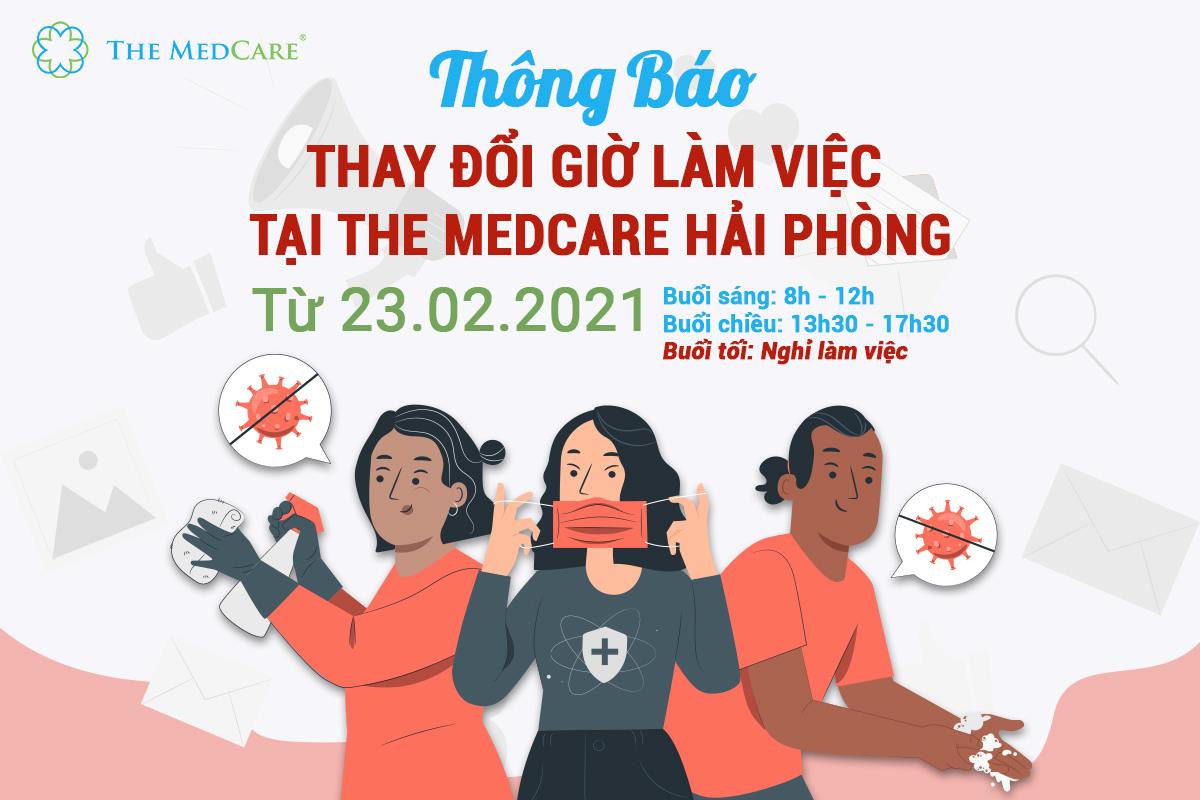 Để phù hợp với tình hình phức tạp của dịch Covid-19 trên địa bàn thành phố, bắt đầu từ Thứ 3 – 23/02/2021, Phòng khám The Medcare Hải Phòng sẽ tạm thời thay đổi thời gian đón tiếp khách hàng, áp dụng tất cả các ngày, cụ thể như sau: Buổi sáng: Từ 08h00